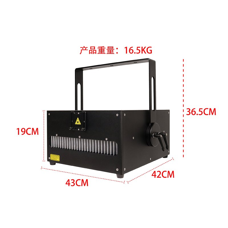 <p>Light source brand:Japan Nichia<br>Light source power:<br>R:6000mW@638nm*1<br>G:6000mW@525nm*1<br>B:8000mW@450nm*1<br>Voltage:110-240V; 50/60Hz<br>Laser color: full color<br>Modulation:100KAnalog/TT<br>Scanning angle:Max60°<br>Scanner:50K<br>Laser show: text/animation/beam/logo/custom<br>Optical path sealing: Features a double-layer structure<br>Heat dissipation mode:air cooling<br>IP rate:lP54<br>Software Control:Pangolin (QS)<br>Working temperature: -20~45°<br>Product size:43*42*19cm<br>Net weight:16.5KG<br>Package size (Carton):51*48*26cm<br>Gross weight (Carton):18.1KG<br>Control mode:lLDA/Sound active/Auto/DMX512/Master-slave</p>