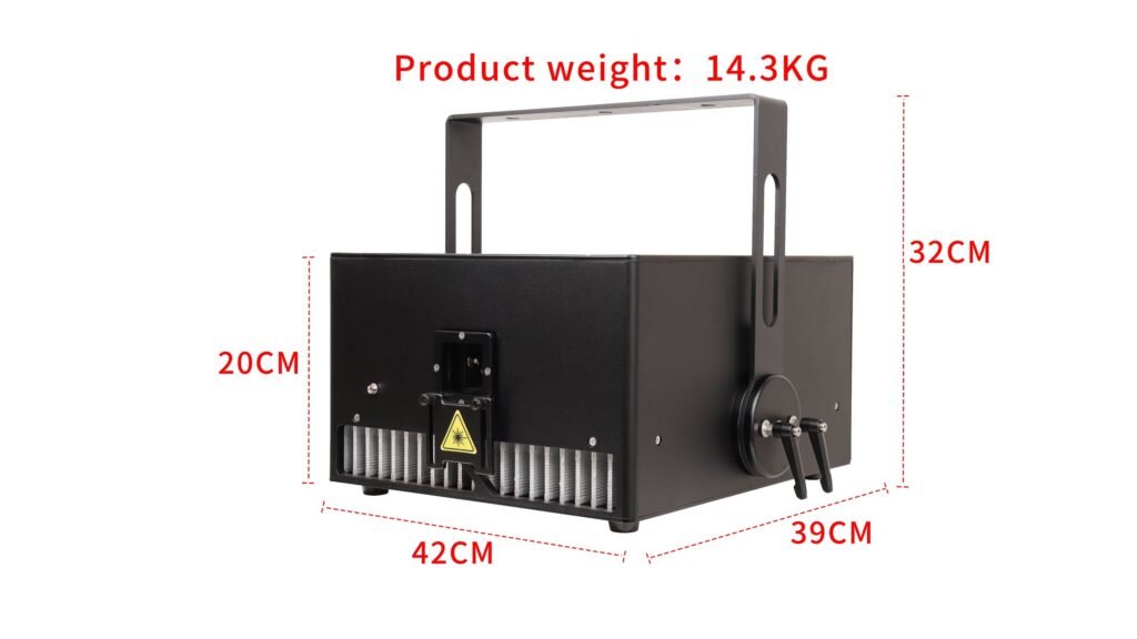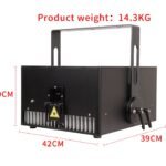 <p>Light source brand:Japan Nichia<br>Light source power:<br>R:3000mW@638nm*1<br>G:3000mW@525nm*1<br>B:4000mW@450nm*1<br>Voltage: 110-240V; 50/60Hz<br>Laser color: full color<br>Modulation: 100K Analog /TTL<br>Scanning angle: Max60°<br>Scanner: 50K<br>Laser show: text/animation/beam/logo/custom<br>Optical path sealing: Features a double-layer structure<br>Heat dissipation mode: air cooling<br>IP rate: lP65<br>Software Control: Pangolin (QS)<br>Working temperature: -20-45°C<br>Product size: 42*39*20cm<br>Net weight: 14.3KG<br>Package size (Carton): 52*48*27cm<br>Gross weight (Carton): 15.7KG<br>Control mode: lLDA/Sound active/Auto/DMX512/Master-slave</p>